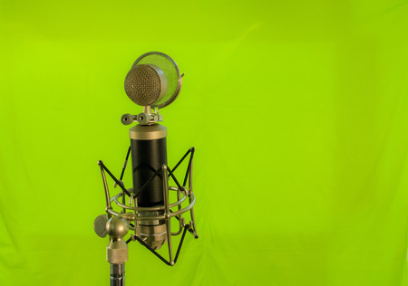 緑の背景に分離のウインド スクリーンとボーカルのコンデンサ マイクのミディアム ショット の写真素材 画像素材 Image