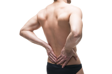 背中の痛みを持つ男 人間の体の痛み 筋肉の男性の体 白い背景上に分離 体の中央部 の写真素材 画像素材 Image